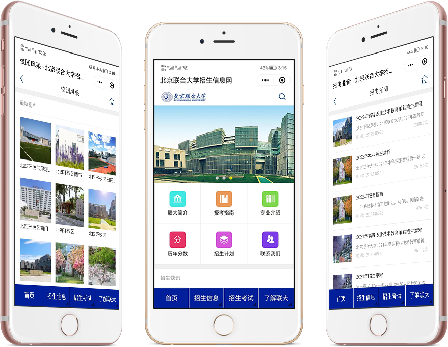 本平臺包含聯(lián)大簡介、報考指南、專業(yè)介紹、歷年分?jǐn)?shù)、招生計劃、招生考試、考生問答、聯(lián)系我們等板塊,對北京聯(lián)合大學(xué)進(jìn)行全方位的展示和介紹,并對每一年的招生信息進(jìn)行通知,歡迎廣大考生及家長通過本平臺進(jìn)行高招相關(guān)問題的咨詢。