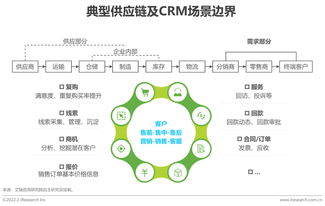 CRM的核心客體是位于供應(yīng)鏈需求部分的客戶,包含分銷商、零售商及終端客戶。服務(wù)邊界除轉(zhuǎn)化外,還包含電商平臺(tái)開發(fā)公司的客戶沉淀、維系,及與之伴生的報(bào)價(jià)、合同訂單、回款、復(fù)購等與客戶需求、客戶交互直接相關(guān)的場(chǎng)景。部門邊界為營銷、銷售及客服。一言以蔽之,CRM的場(chǎng)景邊界是以銷售管理為核心的售前-售中-售后閉環(huán)。在本報(bào)告中,純提供營銷或客服管理模塊的廠商暫不計(jì)入討論范疇。