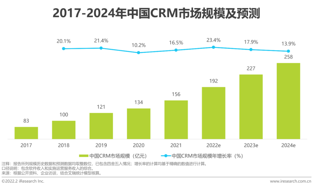 2021年中國CRM市場(chǎng)規(guī)模為156億元,相較2020年增長了16.5%。2020年受疫情影響,企業(yè)IT投入收緊,對(duì)CRM等非直接用于獲客增收的企服軟件的需求下降,資本投資力度也同步收縮,CRM供需疲軟,市場(chǎng)整體增幅放緩,但隨著疫情回暖、市場(chǎng)滲透率提升和社交化、智能化CRM等賽道的發(fā)展,市場(chǎng)增速迅速回升。2023年起,在經(jīng)歷新一輪的快速增長后,預(yù)計(jì)市場(chǎng)將保持10%左右的年增長率平穩(wěn)發(fā)展。預(yù)計(jì)近三年中國CRM市場(chǎng)規(guī)模將增長百億,在2024年總體突破250億元。