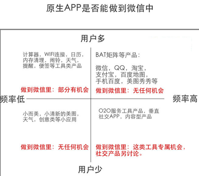 現(xiàn)在從用戶數(shù)和打開頻率來討論下原生APP的四象限,這四象限代表著已經(jīng)存在的需求,這里的用戶多少以BAT的矩陣產(chǎn)品為基準(zhǔn)線,我們從這四個(gè)象限出發(fā)來看下微信服務(wù)號(hào)與之對(duì)應(yīng)的關(guān)系。