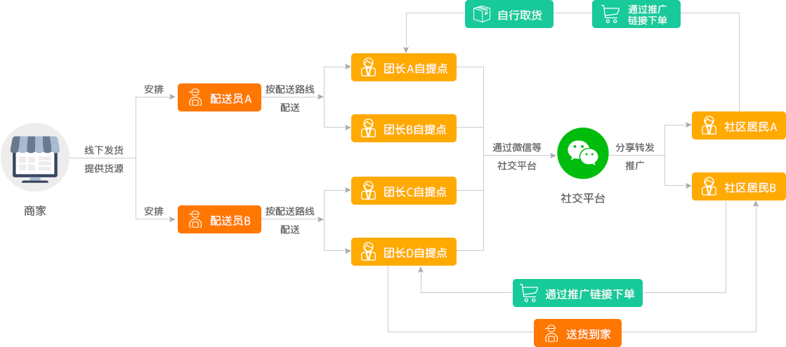 商家根據(jù)訂單量配送至小區(qū)團(tuán)長(zhǎng)處,消費(fèi)者到團(tuán)長(zhǎng)提貨點(diǎn)取貨或者送貨上門(mén)